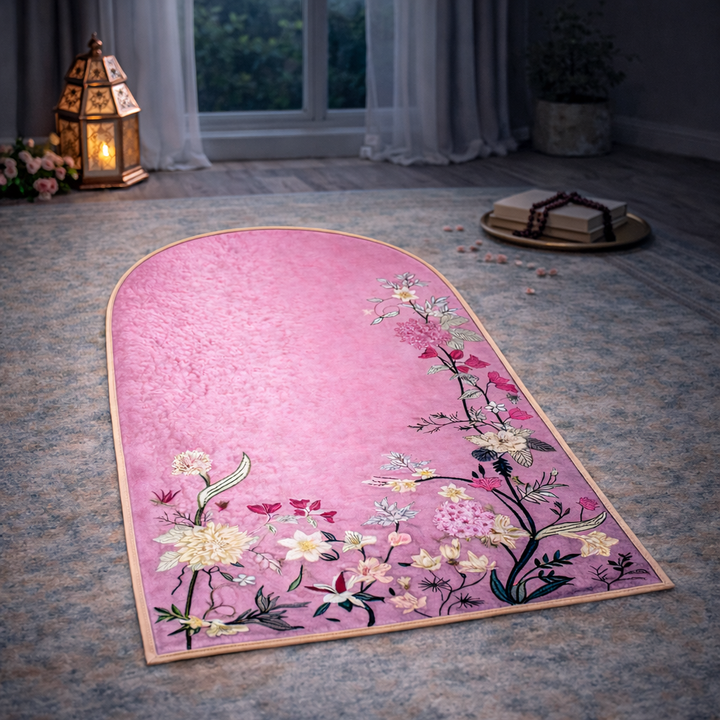 Featuring a soft pink background with delicate floral elements and a graceful arch shape, this prayer mat is designed to create a calm, feminine, and spiritually uplifting prayer experience. -